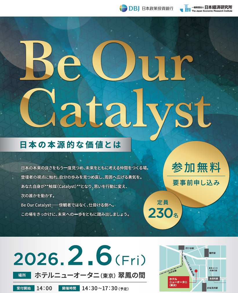 DBJでは、DBJ iHubの一環として、下記イベントを開催いたします。 日本の本来の良さをもう一度見つめ、未来をともに考える仲間をつくる場。 登壇者の視点に触れ、自分の歩みを見つめ直し、周囲へ広げる勇気を。 あなた自身が**触媒(Catalyst)**となり、思いを行動に変え、次の誰かを動かす。 Be Our Catalyst――傍観者ではなく、仕掛け...