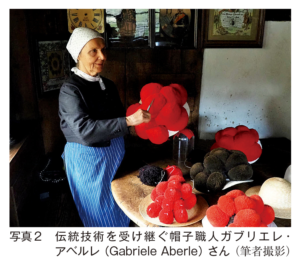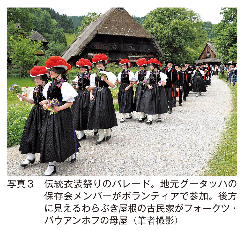 週末には、ボランティアが手工芸の作業や仕事の様子を披露してくれる。木工品作り、糸紬(つむぎ)、レース編み、パン焼きなど。野外博物館のあるグータッハ(Gutach)地域の伝統衣装の帽子を作るアベルレさんもその一人だ(写真2)。この地域の伝統衣装は女性が身に着ける華やかな帽子が特徴で、祭り(写真3)や各種のイベントに登場する。野外博物館、ひいては黒い森地方全体のシンボルになっている。