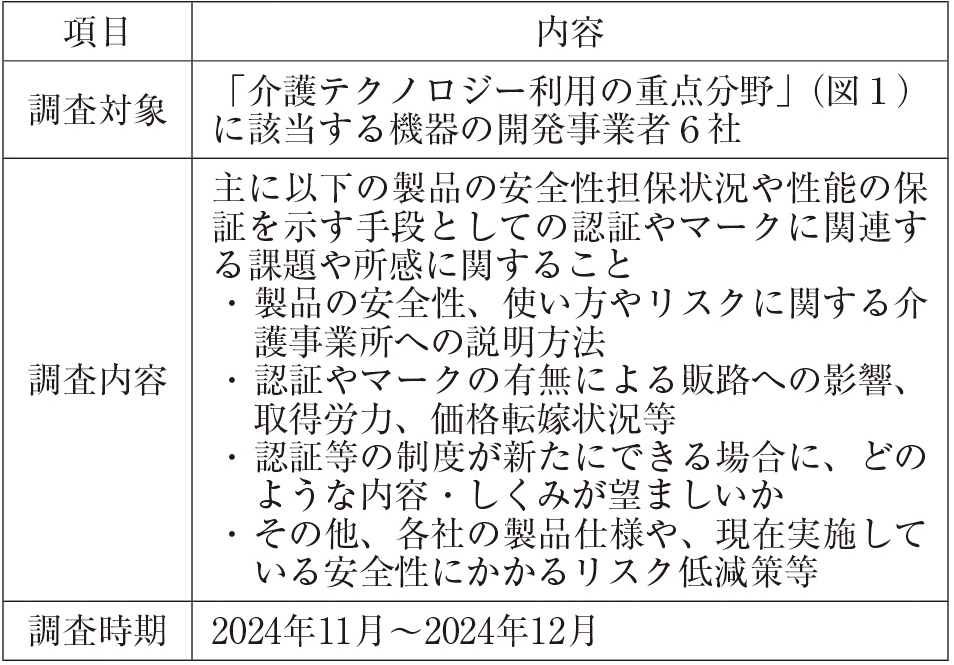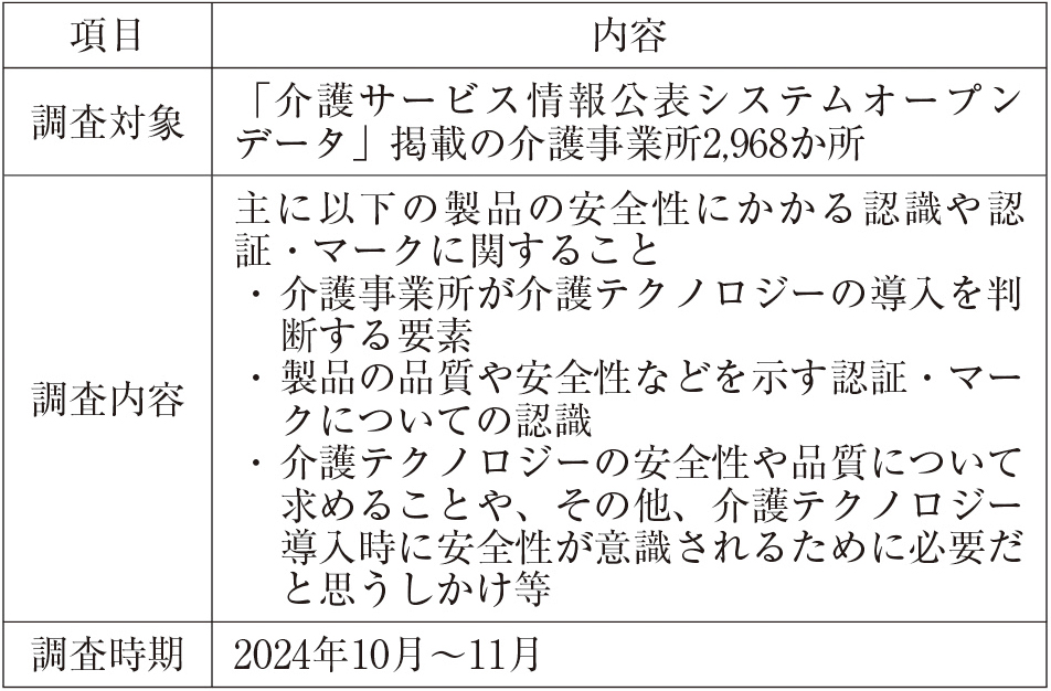 そこで本調査研究(「令和6年度老人保健健康増進等事業 介護ロボット等を安全に利用するための認証制度等に関する調査研究事業」)では、介護事業所へのアンケート調査と開発事業者へのヒアリング調査を通じ、上記の仮説にかかる実態を把握するとともに、機器の安全性に関する開発事業者側及び介護事業所側双方の所感や、介護事業所が自事業所に適した機器を選択し、安全に活用するために必要なことを整理した。加えて、介護に使われる機器や用具への評価や認証を行う団体にヒアリング調査を行い、認証・評価の狙い、付与までの過程や、基準等の現状及び第三者的な立場から見た開発事業者側と介護事業所側との課題を調査した。そのうえで、介護事業所をはじめとした使用者が適切に選択・導入して安全に活用することに資する介護テクノロジーの認証等のあり方を提言した。調査結果の詳細は弊社ホームページ(https://www.jeri.co.jp/report/elderlyhealth-r6-2/)にて掲載している。本稿ではその中から一部を抜粋して紹介したい。