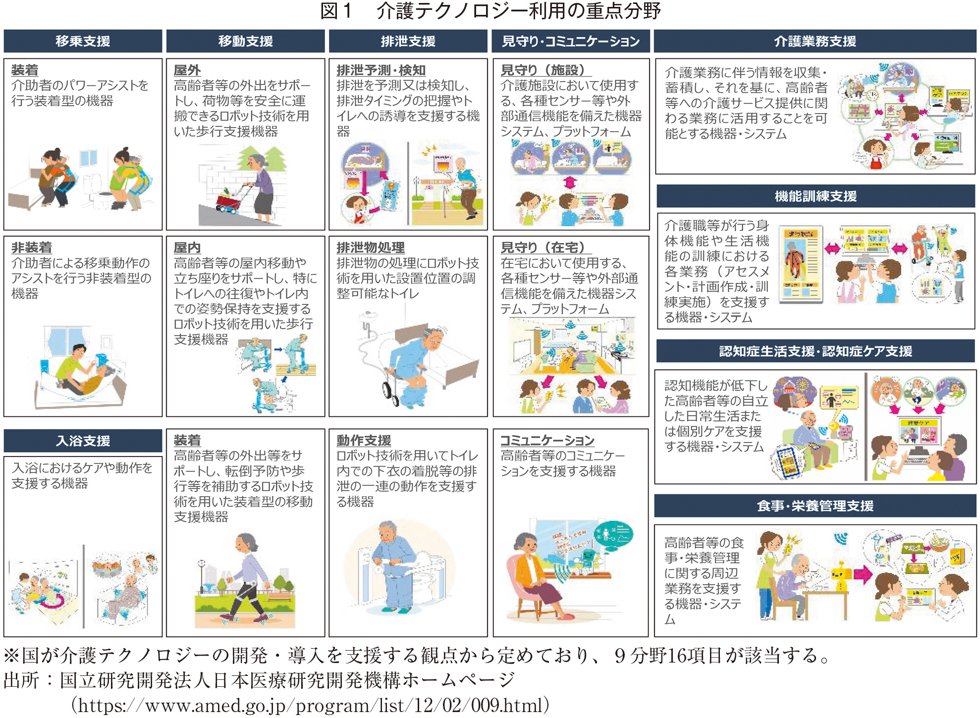 国は「介護テクノロジー利用の重点分野」(図1)を定めており、これは開発事業者にとってどのような機器のニーズがあるのかというヒントにはなるものの、大まかな性能要件以外の詳細な安全基準等はなく、重点分野以外を含む介護テクノロジー全体の定義や求められる安全性能等も示されていない。現在は、開発事業者は個別の知見や製品安全確保の考えに基づき製品を開発し、それらが結果的に介護テクノロジーに当てはまる製品になっている状況である。今後、当分野の参入企業がますます増えると予想される中、介護テクノロジーと見なされる製品の開発に関して、安全確保にかかる共通認識がないことは大きな懸念となり得る。