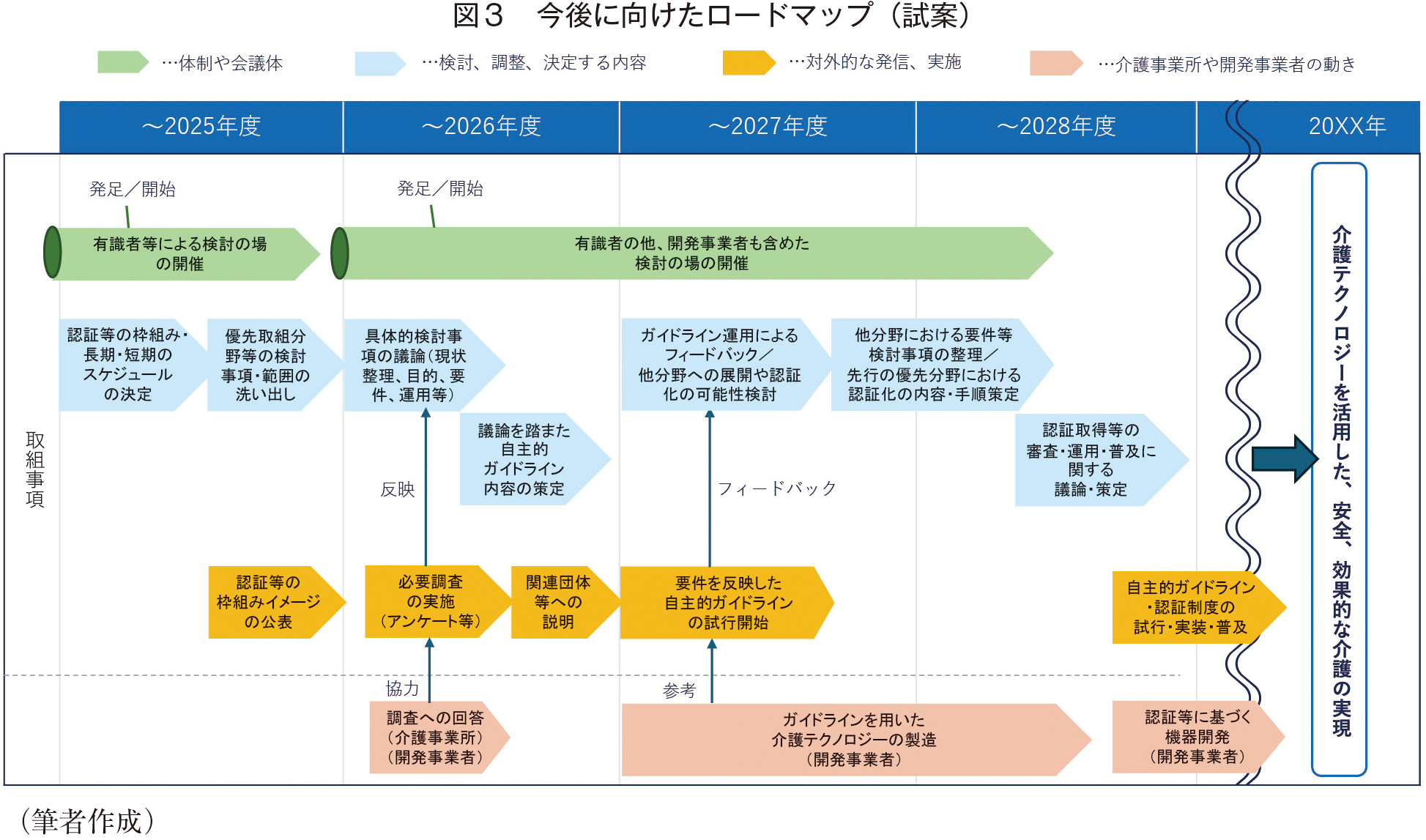 このロードマップで示したように、現実的かつ適切な全体工程を策定し、安全等に関する基準の共通認識の範囲を徐々に拡大していくことが、介護テクノロジーによる安全で効果的なケアが行われる未来のためには重要であると考えられる。