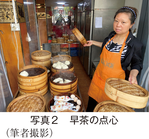 最終日の朝も飲茶を食べることにした。日本人は飲茶をランチに食べると思っている人が多いが、実は中国では朝食べるもので、「早茶」と呼ばれている。飲茶は明代の揚州が起源(そこから清代に広州へ伝わった?)と聞いたことがあったが、どうだろうか。ただ早茶の看板はよく見かけ、この地に根付いている様子が窺われる。のんびりした店内で、点心として「五丁包」(前回は三丁包)を頼み、主食は「腰花煨麺」を注文してみる。