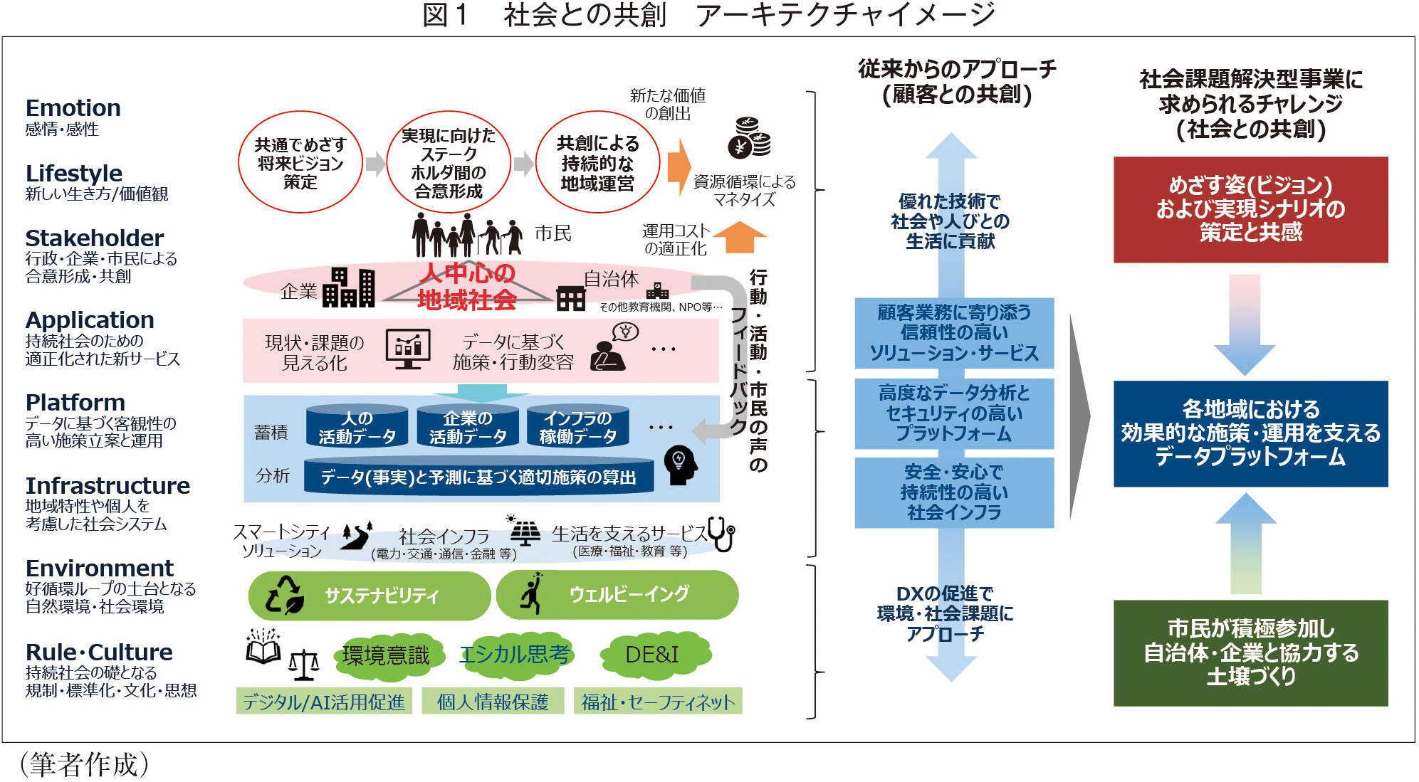 前述のとおり、社会との共創を通じて社会課題解決に取り組み、持続可能な社会と経済活動を実現するために、大きく①ビジョン形成とシナリオ設計、②市民参加の促進、③データに基づく効果的な施策立案やサービス運用、の3つの視点が必要となる。以下、それぞれについて説明する。