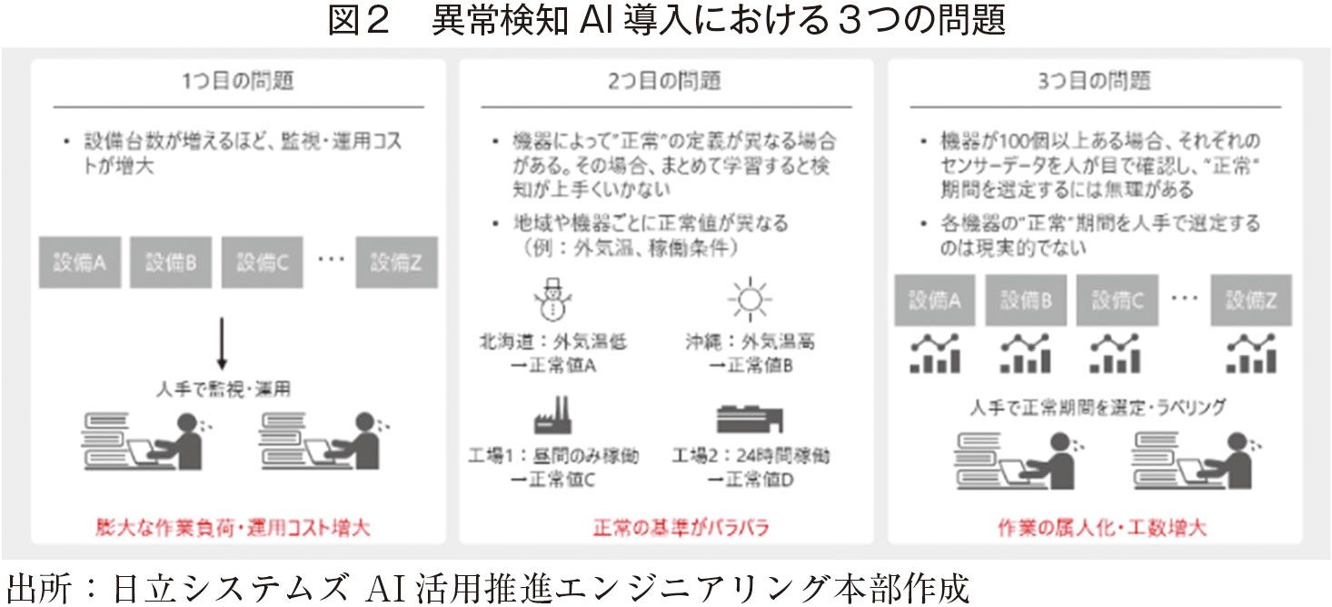 設備管理の異常検知AI導入には3つの問題(図2)が存在する。1つ目は「機器ごとに異常検知AIを運用する必要があるため、機器の台数が増えるほど監視やメンテナンスの負担が増大する」ことである。2つ目は「地域や設備ごとに“正常”とされる状態が異なるため、まとめて学習すると誤検知が多発する」ことである。北海道と沖縄では外気温が異なるし、昼間稼働の設備と24時間稼働の設備では稼働条件が異なる。これらを区別せずに学習させてしまうと、狼少年のようなAIに大切な設備管理を託すことになる。3つ目は「AIに学習させるために、各機器の“正常な期間”を人が選定し、ラベル付けを行う作業が必要だが、属人化と膨大な工数を要する」ことである。例えば、機器が100台ある場合、各機器のセンサーデータを目視確認し、機器ごとに“正常な期間”を選定しなければならない。これら3つの問題は、人材・人手不足の中で設備管理の効率化を図る際の大きな障壁となっていた。