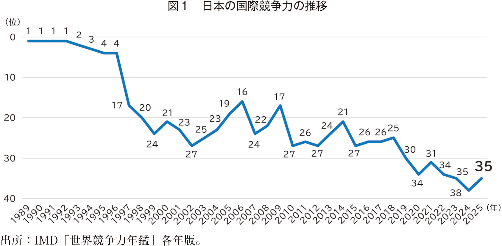 かつて日本経済は、先進主要国で突出して高い経済成長を実現し、世界からもその優れた経済システムに大きな注目が集まった。しかし、1990年代初頭のバブル崩壊を転機に、日本経済は深刻な長期停滞に陥り、1990年代半ば以降の約30年間、その平均成長率は、先進主要国のなかで最も低い国の1つになってしまった(福田(2018))。それに伴い、図1が示すように、1990年代初頭には世界のトップであった国際競争力は大幅に低下し、現在は世界の30位台半ばに沈んでいる(IMD(スイスのビジネススクール国際経営開発研究所)「世界競争力年鑑」)。とりわけ、かつては日本の成長を牽引してきた製造業の国際競争力の低下が顕著で、近年、多くの分野で韓国や中国などの新興企業に市場を奪われてしまっている。