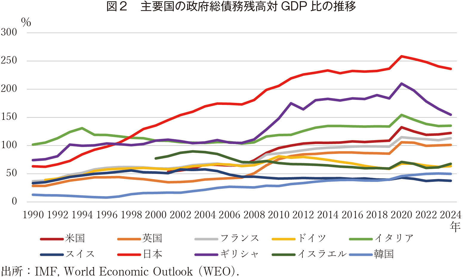 政府債務を他の先進国と比較した場合、日本の現状はきわめて深刻である。たとえば、IMFの試算に基づいて一般政府(中央政府、地方政府、および社会保障基金)の債務残高の対国内総生産(GDP)比率をみると、政府が保有する資産を考慮しないグロスでは、2024年におけるわが国の比率こそコロナ禍の2020年からは減少しているとはいえ、依然として約236%と他の先進国に類を見ない高水準である(図2)。その値は、資産を差し引いたネットでは大幅に低下する。しかし、それでも比率は約130%と、財政事情が危機的なギリシャやイタリアと同程度で、深刻さには変わりがない。そもそも、政府が保有する金融資産の大半を占める公的年金の積立金は、将来の年金給付の財源であり、財政赤字の穴埋めに使えるものではない。