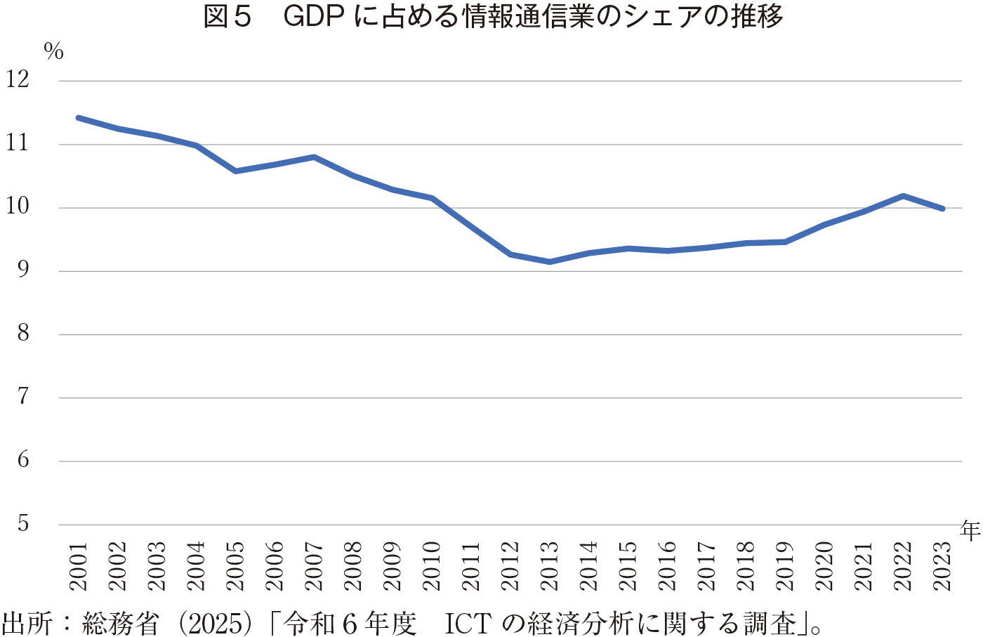 もっとも、これらの規制は、情報・データという資源を利活用して生まれるイノベーションとはトレードオフの関係にある。情報革命のなかで、情報・データを利活用した更なるイノベーションによる成長の促進と、それに伴う格差の拡大という問題を、今後どこまでバランスをとって規制していけばよいのか、これまで以上に難しい時代に入ってきている。特に、日本では、世界的に情報・データの利活用が進むなか、さまざまな分野でデジタル化の遅れが指摘されてきた。GDPに占める情報通信業のシェアも、2000年代を通じてむしろ減少傾向が顕著であった(図5)。情報・データを持つ負の側面をいかに克服し、世界で進む情報・データの利活用の流れにいかに乗り遅れないようにするかは、日本経済が長期停滞から再生するに際しての新たな課題といえる。
