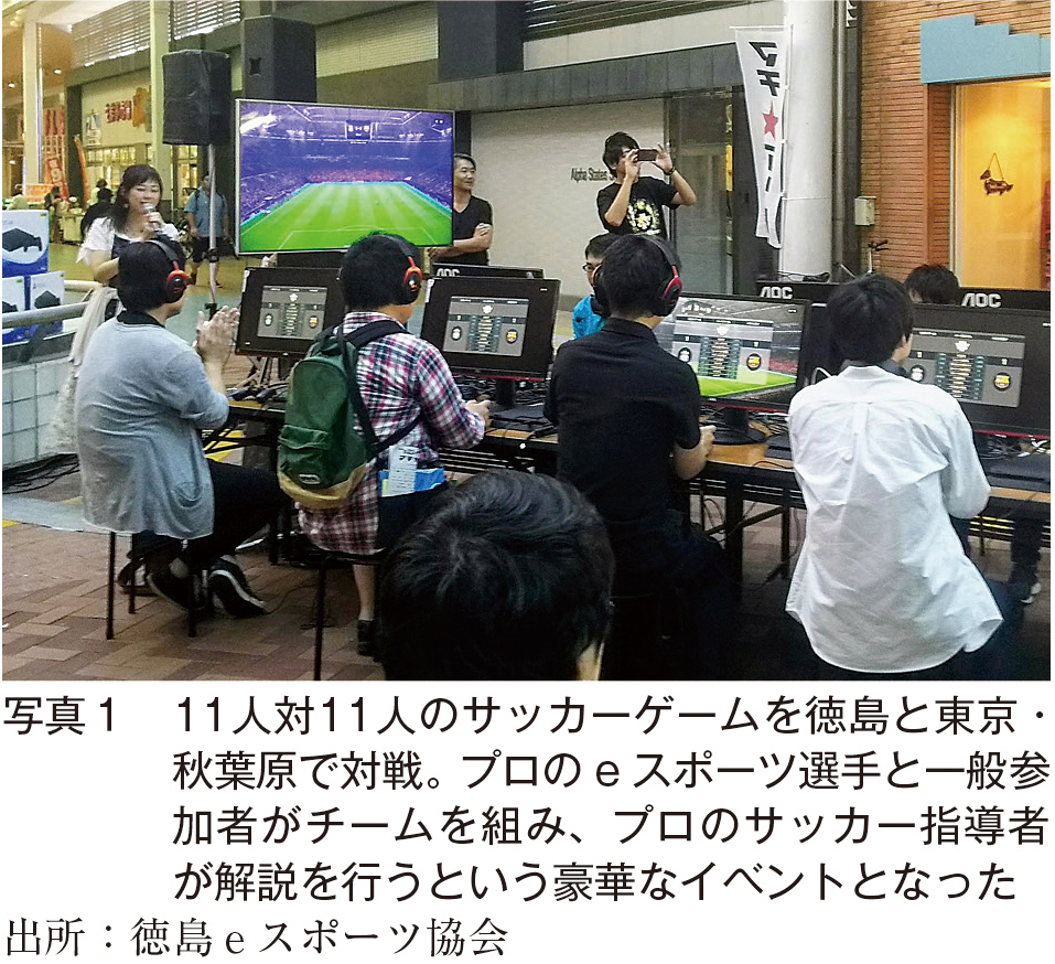 この年、陸上や水泳のようにeスポーツも競技種目に加えられたジャカルタ・アジア大会が開催されるといった時流にも乗って、この企画は、予想を大きく上回る反響をいただきました。そこで、同年秋のスポーツの日に開催された「マチ★アソビ」では、新たな趣向として、サッカーゲーム『ウイニングイレブン』を、ゲーム中の選手1人をプレイヤー1人が操作するモードで、会場である徳島の商店街と、東京・秋葉原のeスポーツスタジオとをオンラインでつなぎ、徳島と東京に分かれて「11人」と「11人」が試合するというオンライン対戦会を開催しました。