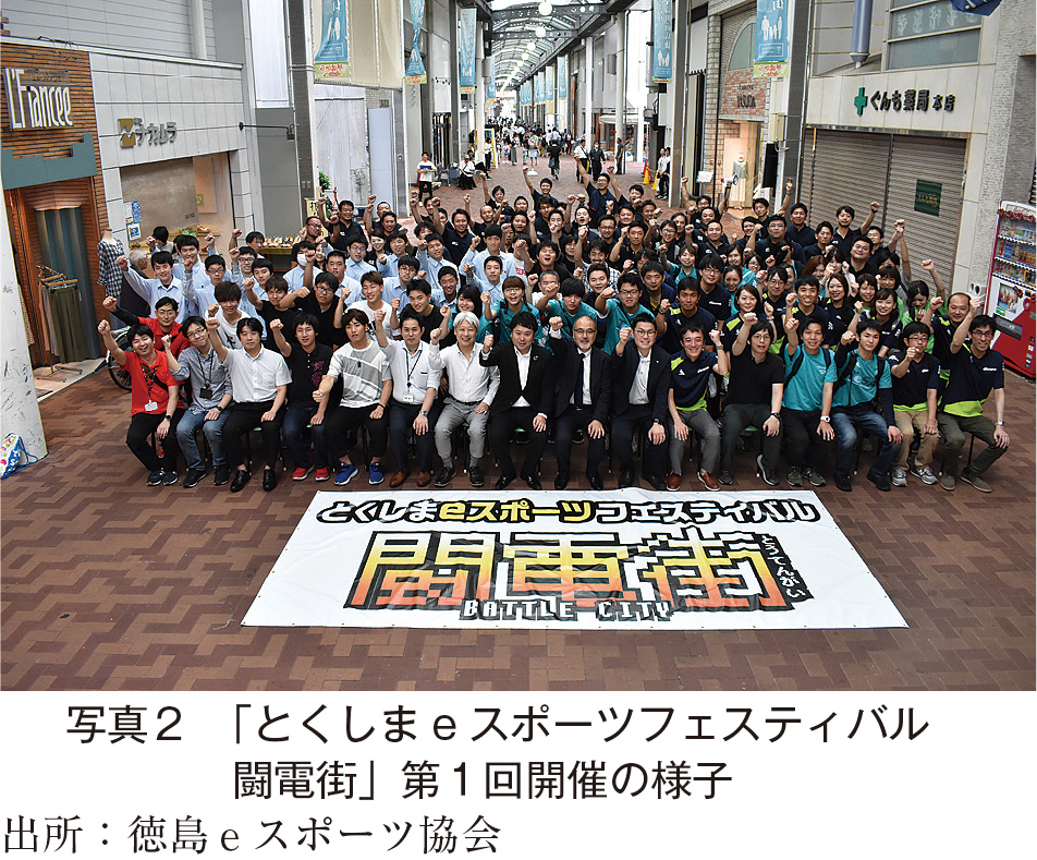 イベントを通じた「にぎわい創出」はもちろん、多様な方々が一緒にプレイできるeスポーツだからこそ可能となる「教育」や「福祉」といった様々な分野での活用の期待から、若手経営者のグループ「徳島青年会議所」を核に、徳島県はもちろん、中心市街地の商店街、県内の大学や高専、専門学校、金融機関など多くの主体に参画いただき、2019年3月、「徳島eスポーツ協会」が発足することになります。そして、同年7月には、協会が主催となって、子供から大人まで、1日で5,000人もの来場者を呼び込むeスポーツを核としたお祭りイベント「闘電街(とうてんがい)」が開催されました(写真2)。このイベントは2019年の第1回を皮切りに以降毎年開催され、現在も続く恒例のイベントとなっています。