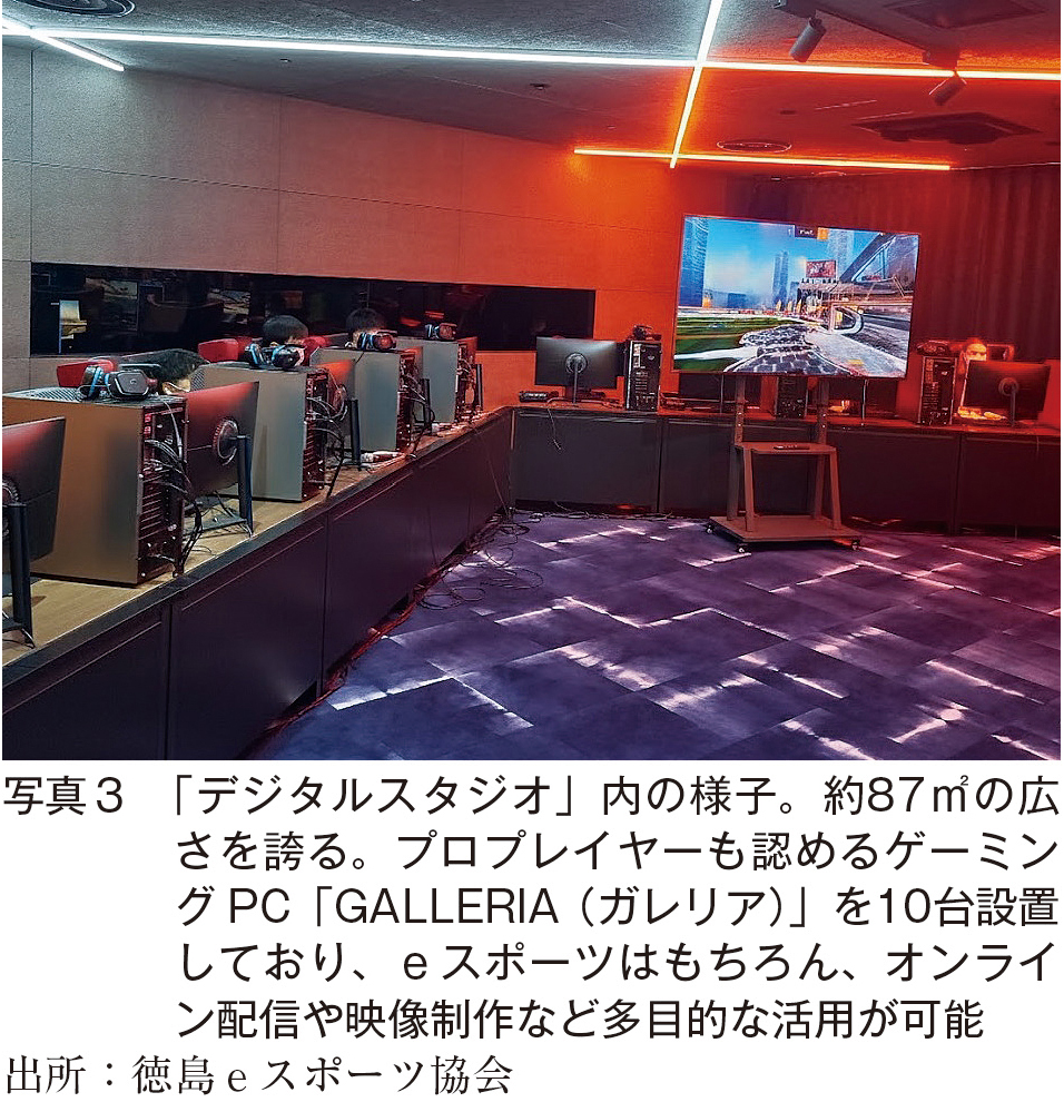 その後のコロナ禍で、多くのリアルスポーツが影響を受ける中、オンラインでの対戦が可能なeスポーツの利点を活かした交流試合や全国大会など、徳島県そして徳島eスポーツ協会では、ゲームを通じての人のつながりづくりを一層広げていきます。こうした活動が結実する形で、徳島県は、2022年9月、徳島駅前商業施設に、全国初となる「県立の常設eスポーツ活動拠点」として、「デジタルスタジオ」をオープンさせることとなりました。